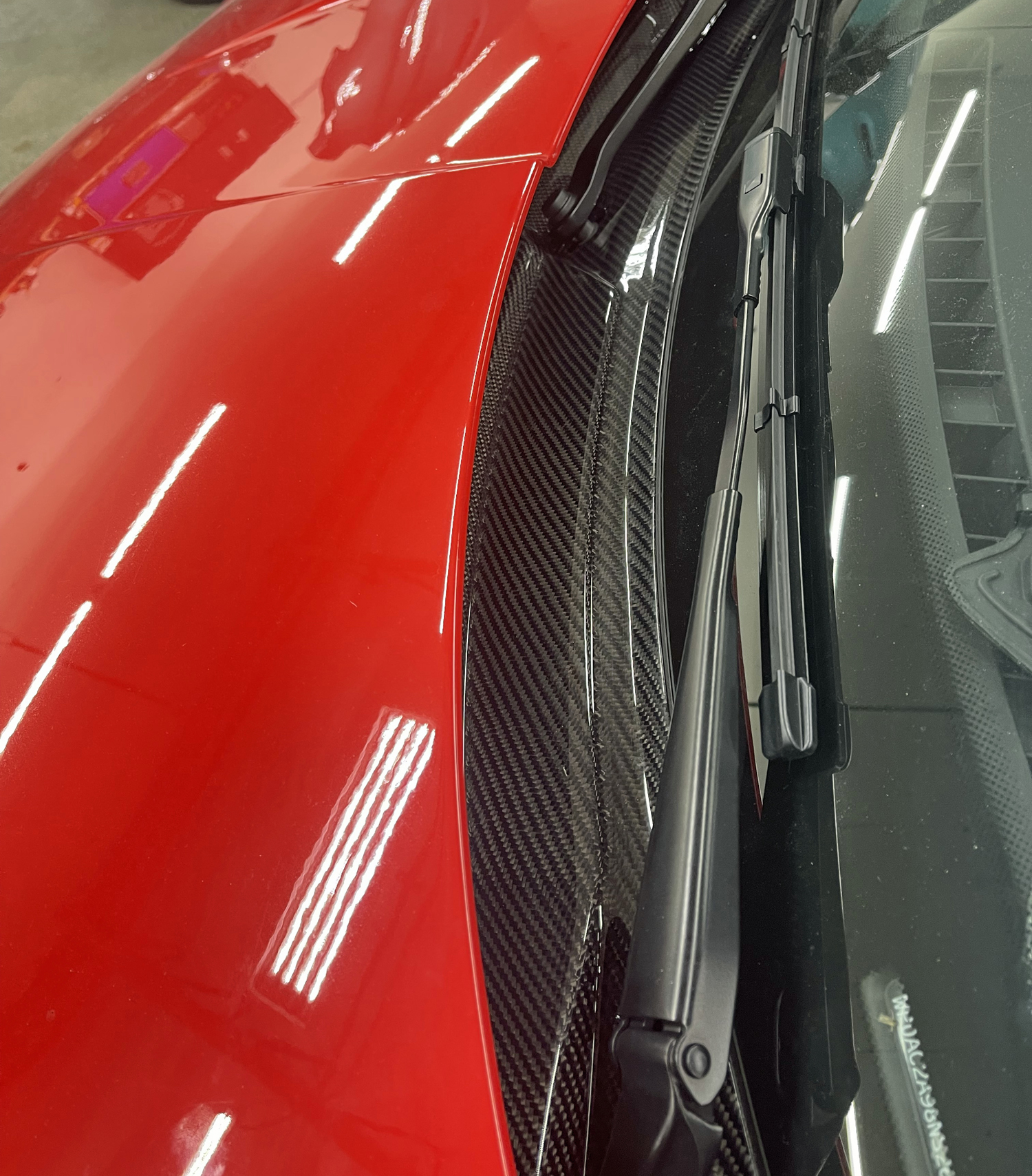 On the exterior we offer carbon parts like the side mirror housings, the mirror triangles, the center air intake at the front bumper, the spoiler lip with the side wings, side skirts, door handles, the engine lid grill, the diffusor, the rear bumper trim panel with the exhaust surround and at the rear wing the end blades and supports.